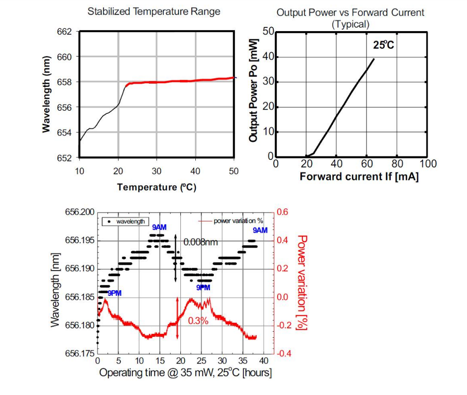 658nm Wavelength Stabilized Laser is a single mode, miniature laser in a standard TO package. The laser has a very low temperature dependence and precise center wavelength overthe locked region.The narrow linewidth and long coherence length from a standard TO packaged laser enables many applications.